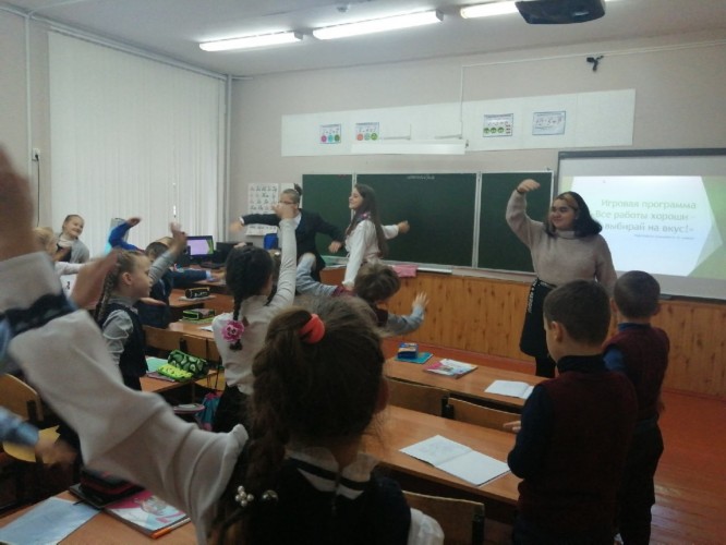Участниками школьного об единения профориентации была проведена интерактивная игровая программа для учащихся 2-ых классов "Все работы хороши, выбирай на вкус" с целью ранней профессиональной ориентации. Ребята активно участвовали в программе: разгадывали загадки, решали ребусы, изображали деятельность представителей различных профессий, проявили сообразительность и смекалку и поделились своей мечтой о будущей профессии.